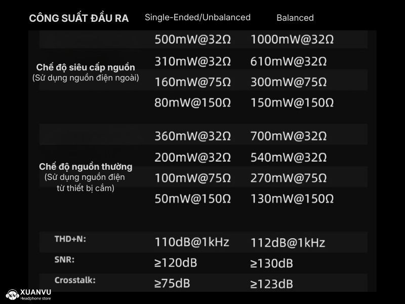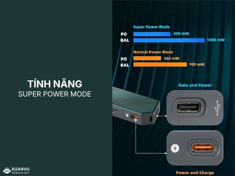 Điểm ăn tiền nhất của xDuoo Link 3 chính là tính năng Super Power Mode (Siêu cấp nguồn) với công suất đầu ra cực kỳ ấn tượng lên tới 1000mW@32ohm (4.4mmBAL). Để đạt được công suất đầu ra khủng như vậy, xDuoo Link 3 được trang bị thêm 1 cổng USB - C bên thân máy hỗ trợ cấp nguồn bổ sung và sạc. Mức công suất này đủ sức "trị" cả những dòng tai nghe Over-ear cứng đầu hay tai nghe từ phẳng (Planar).