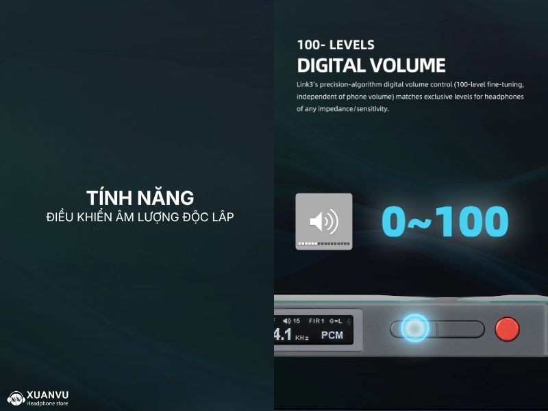 Link 3 sở hữu hệ thống chỉnh âm lượng kỹ thuật số 100 bước (100-step) tách biệt hoàn toàn với âm lượng trên điện thoại. Điều này cực kỳ quan trọng đối với người dùng IEM, giúp bạn tìm được mức âm lượng chính xác nhất mà không bị hiện tượng "nấc quá to, nấc lại quá nhỏ".