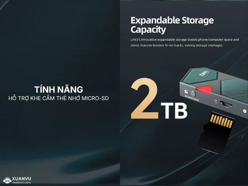 Đây là tính năng độc bản của dòng Link 3. Bạn có thể cắm thẻ nhớ chứa toàn bộ kho nhạc Lossless của mình vào thiết bị. Với việc hỗ trợ khe cắm thẻ nhớ Micro SD lên tới 2TB, người dùng hoàn toàn có thể biến chiếc DAC/AMP thành một thư viện nhạc di động tiện lợi và giảm tải bộ nhớ cho thiết bị phát.
