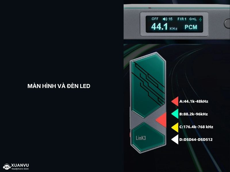 xDuoo Link 3 trang bị màn hình TFT có thể tùy chỉnh màu, giúp người dùng dễ dàng theo dõi các thông số khi chơi nhạc. Bên cạnh đó, sản phẩm cũng được trang bị đèn LED đa sắc có chức năng thay đổi màu sắc dựa trên tần số lấy mẫu (Sampling Rate) giúp bạn nhận biết ngay lập tức file nhạc đang phát là chuẩn gì (MQA, Hi-Res hay DSD).