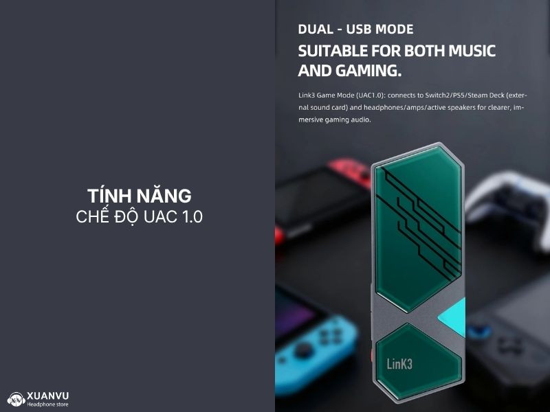 Khả năng chuyển đổi qua chuẩn UAC 1.0 giúp Link 3 tương thích hoàn hảo với các hệ máy chơi game như Nintendo Switch, PS5 và Steam Deck, mang lại âm thanh game sống động và uy lực hơn hẳn so với cổng 3.5mm mặc định trên máy.