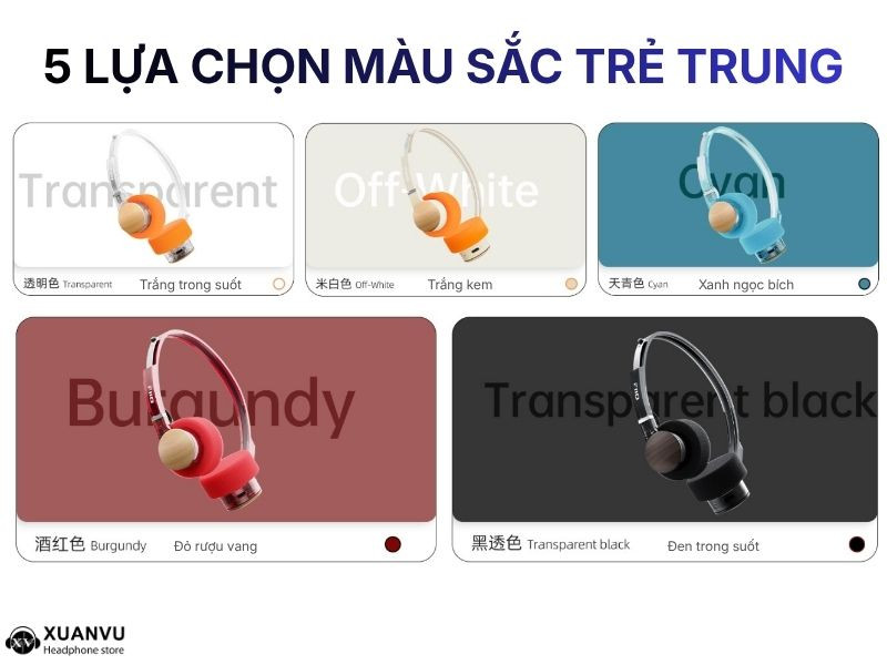 Được định hình là tai nghe dành cho giới trẻ, Fiio EH11 trình làng với 5 phiên bản màu cực bắt mắt: Transparent (Trắng trong suốt), Off-white (trắng kem), Cyan (xanh ngọc bích), Burgundy (đỏ rượu vang) và Transparent Black (Đen trong suốt).