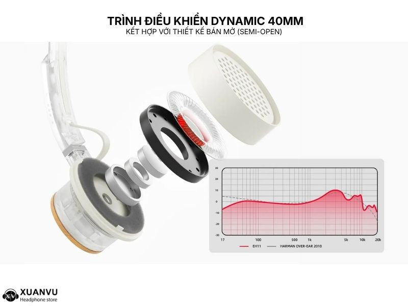 Fiio EH11 trang bị Driver Dynamic đường kính lớn 40mm với màng loa composite có độ giảm chấn cao. Thiết kế này giúp dải trầm (Bass) xuống sâu tới 17Hz, tạo ra tiếng bass uy lực, chắc gọn nhưng vẫn giữ được dải trung (Mid) trong trẻo.