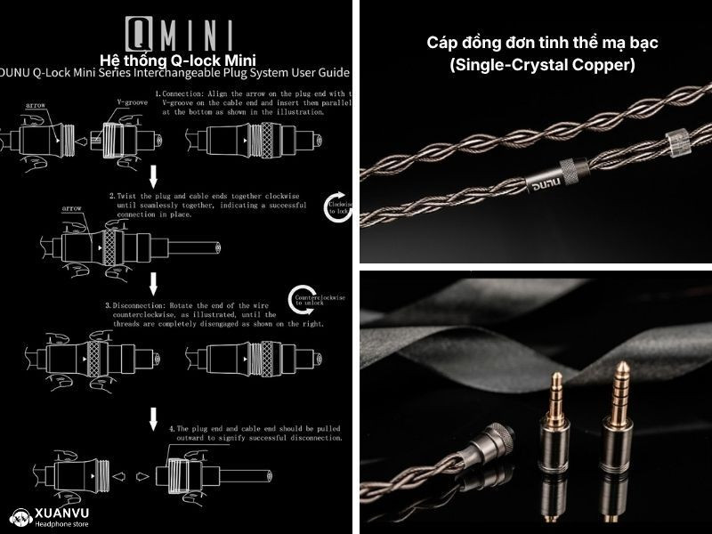 - Q-Lock Mini: Hệ thống chân cắm có thể thay đổi linh hoạt giữa 3.5mm Single-ended và 4.4mm Balanced, giúp tai nghe tương thích hoàn hảo với mọi thiết bị từ smartphone đến máy nghe nhạc chuyên dụng.