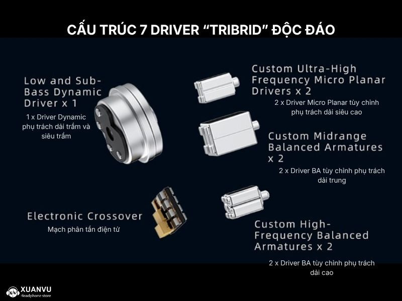 - 2 Micro Planar Driver (Driver từ phẳng) tùy chỉnh: Chuyên biệt cho dải siêu cao (Ultra-high), mang lại độ mở rộng tần số cực cao (lên đến 40kHz)