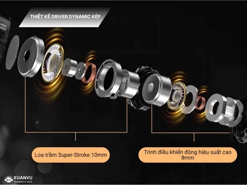 - Driver Bass 10mm (Super-Stroke): Chuyên trách dải siêu trầm (sub-bass) có thể xuống sâu tới 20Hz. Dải bass được tái tạo đầy uy lực, có độ nảy và tốc độ phản hồi nhanh, cực kỳ phù hợp cho các bản nhạc Rock, Symphony hoặc tiếng nổ trong game FPS.
