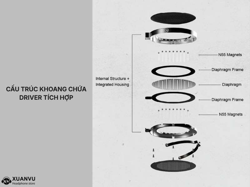 Cấu trúc khoang chứa Driver tích hợp của Moondrop Skyland được thiết kế đột phá nhằm tạo ra một không gian xếp chồng tối ưu cho màng loa FDT siêu lớn và hệ thống mạch từ mở rộng. Thiết kế này đảm bảo tạo ra một từ trường hoàn chỉnh và đồng nhất, bao phủ toàn bộ vùng rung động của màng loa.