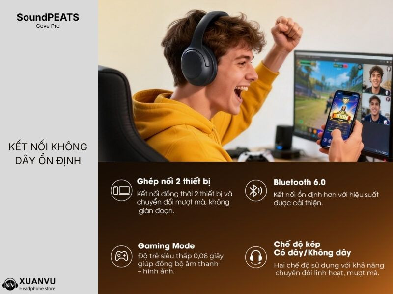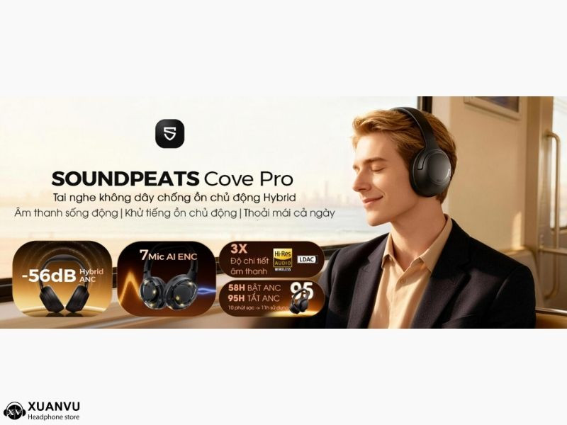 Với hàng loạt công nghệ nổi bật như Hi-Res Audio kép, LDAC, driver 40mm phủ titanium, chống ồn Hybrid 7 micro và thời lượng pin lên đến 95 giờ, tai nghe bluetooth SoundPEATS Cove Pro là lựa chọn toàn diện trong phân khúc tai nghe chụp tai không dây.Nếu bạn đang tìm kiếm một chiếc tai nghe “all-in-one” vừa mạnh về công nghệ, vừa tối ưu trải nghiệm sử dụng, SoundPEATS Cove Pro là cái tên rất đáng để cân nhắc. Liên hệ ngay hotline 097395 3333 | 028 73002728 của Xuân Vũ Audiop
