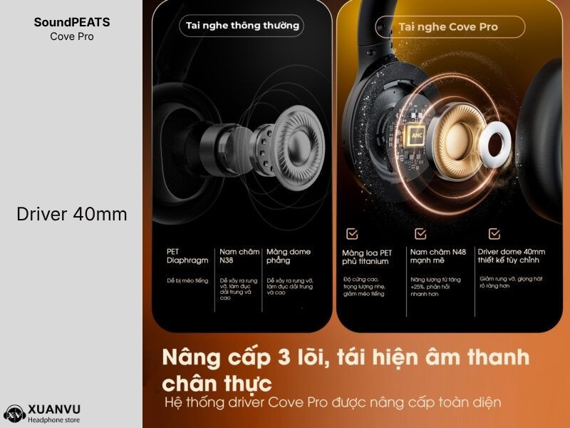 SoundPEATS Cove Pro được trang bị màng lo 40mm, kích thước phổ biến trên các dòng tai nghe chụp tai cao cấp hiện. Màng loa phủ titanium, giúp mang lại độ cứng cao và trọng lượng nhẹ hơn, giúp kiểm soát dao động tốt hơn.