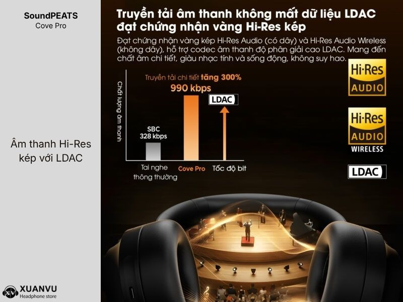 Điểm nổi bật của tai nghe bluetooth SoundPEATS Cove Pro có thể nhắc đến là chứng nhận Hires kép, có nghĩa là người dùng có thể nghe được âm thanh chất lượng cao khi sử dụng tai nghe ở chế độ có dây và không dây. Khi kết hợp với codec LDAC, tai nghe có thể truyền tải dữ liệu âm thanh lên đến 990kbps, giúp giữ lại nhiều chi tiết hơn so với các chuẩn Bluetooth thông thường.