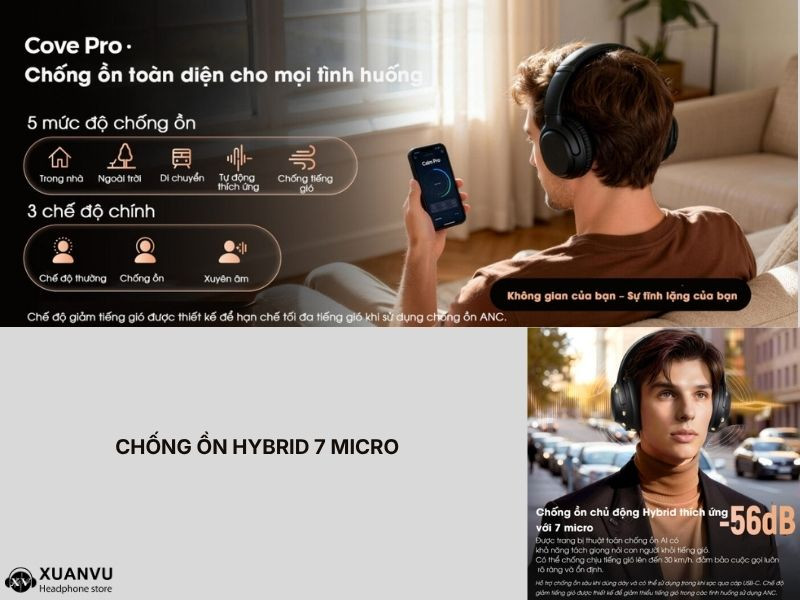 Một trong những điểm đặc biệt trên tai nghe SoundPEATS Cove Pro là hệ thống chống ồn Hybrid sử dụng 7 micro, với khả năng triệt tiêu tiếng ồn lên đến 56dB. Công nghệ này giúp tai nghe loại bỏ hiệu quả tạp âm từ môi trường xung quanh.
