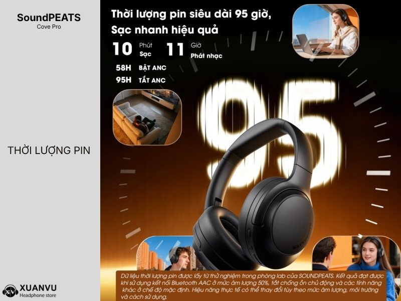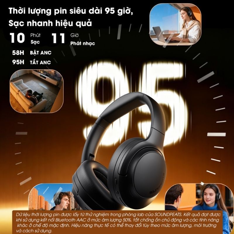 Tai nghe bluetooth SoundPEATS Cove Pro cung cấp thời gian sử dụng lên đến 95 giờ khi tắt chống ồn và 58 giờ khi bật ANC, đáp ứng nhu cầu sử dụng nhiều ngày liên tục mà không cần sạc.