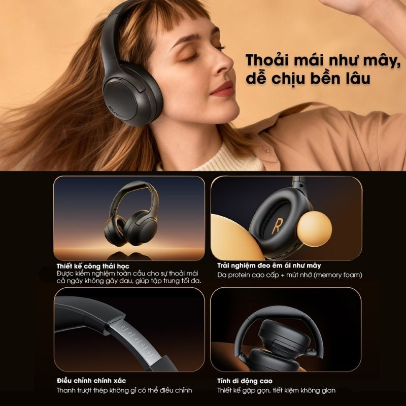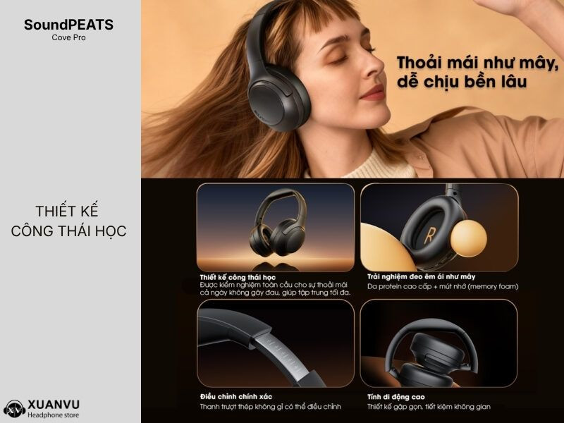 Tai nghe bluetooth SoundPEATS Cove Pro là mẫu tai nghe over-ear nổi bật trong phân khúc 1 triệu đồng khi sở hữu hàng loạt công nghệ vượt trội như Hi-Res Audio kép (có dây & không dây), codec LDAC, chống ồn Hybrid với 7 micro và thời lượng pin lên đến 95 giờ. Không chỉ sở hữu thông số khủng, Cove Pro còn tối ưu trải nghiệm thực tế với thiết kế đeo êm ái, độ hoàn thiện cao cấp, độ trễ thấp và hỗ trợ ứng dụng để điều chỉnh.