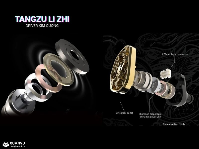 Điểm đắt giá nhất và cũng là linh hồn của Tangzu Li Zhi chính là driver đơn Dynamic đường kính 10mm với màng loa phủ kim cương (Diamond Diaphragm) cùng nền tảng với củ loa trong phiên bản Flagship Tangzu The King Wukong, đã được tinh chỉnh để mang lại hiệu suất toàn dải. Kim cương được sử dụng ở đây không chỉ là lớp phủ thông thường mà là màng loa tinh thể kim cương thật được chế tạo bằng phương pháp bay hơi, mang tới độ cứng lớn hơn 40% các lớp phủ DLC truyền thống và các ưu điểm như: