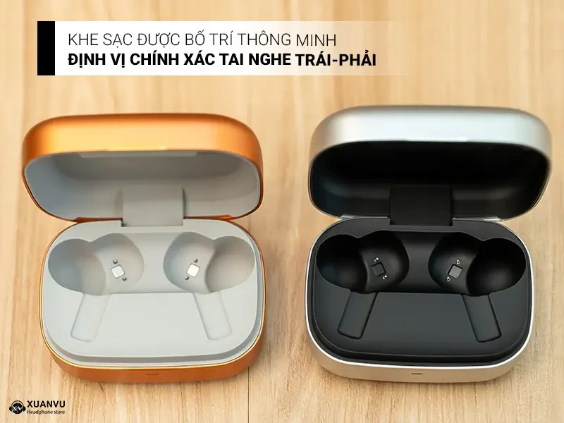 Hộp sạc mang đến cảm giác mở đóng mượt mà nhờ bản lề giảm chấn được tích hợp khéo léo, giúp phần nắp luôn vận hành êm ái và không bất ngờ sập xuống dù có rung lắc nhẹ. Bên trong, các khe sạc được bố trí thông minh để định vị chính xác tai nghe trái – phải, kết hợp cùng cơ chế hút nam châm chuẩn xác, giúp việc đặt tai nghe vào hộp trở nên cực kỳ dễ dàng và trực quan – chỉ cần nhẹ nhàng thả tay, tai nghe sẽ tự động nằm gọn đúng vị trí và bắt đầu sạc.