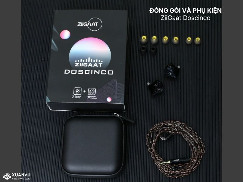 Vẫn giữ nguyên ngôn ngữ thiết kế và phong cách đóng hộp của hãng, ZiiGaat Doscinco được đóng gói theo hướng tối giản nhưng thực dụng, tập trung chính vào chất lượng của tai nghe. Ngoài đôi củ tai (housing) được đúc resin với họa tiết bắt mắt ra, người dùng sẽ có những phụ kiện cơ bản bao gồm