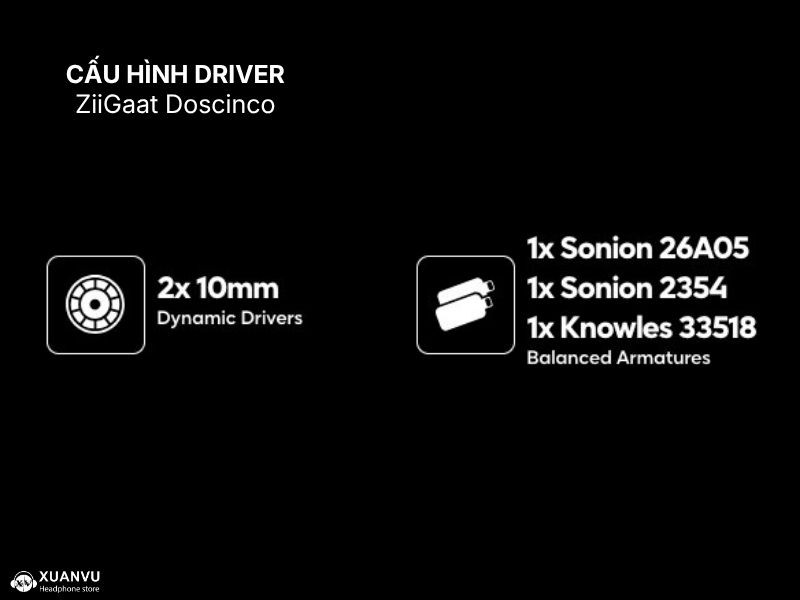 Ziigaat Doscinco được trang bị cấu hình "đủ xài" với hai driver dynamic 10mm màng polymer được sắp xếp theo cấu trúc isobaric (đồng áp) trong một khoang tiêu âm độc quyền cộng thêm 2 Driver BA tới từ nhà Sonion là 26A05 và 2354 cùng với 1 Driver BA tới từ nhà Knowles mang số 33518.